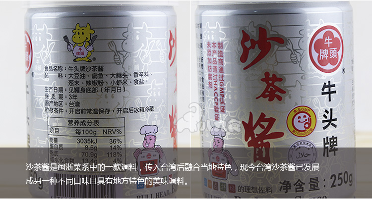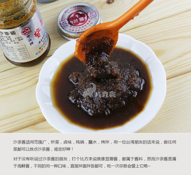 牛头牌沙茶酱为沙茶酱料之顶级调味品, 用于沾/炒/卤/拌/烤! 样样皆美味. 【沙茶酱】的绝妙口感众所皆知,它是经过前人长时间的研究发展,才成为综合调味料中的佼佼者,关于沙茶酱的来源众说纷云,最可靠的来源是以前马来西亚人将猪、牛肉串成一串,边烤边涂调味料,中国人便称此种调味料为「沙茶」, 并由马来西亚传入潮州,再经由潮州师傅精心调制与不断改进,沙茶酱不久便风闻各地,且被广泛用在中国各种烹调料理上,成为中国美食的调味之王。