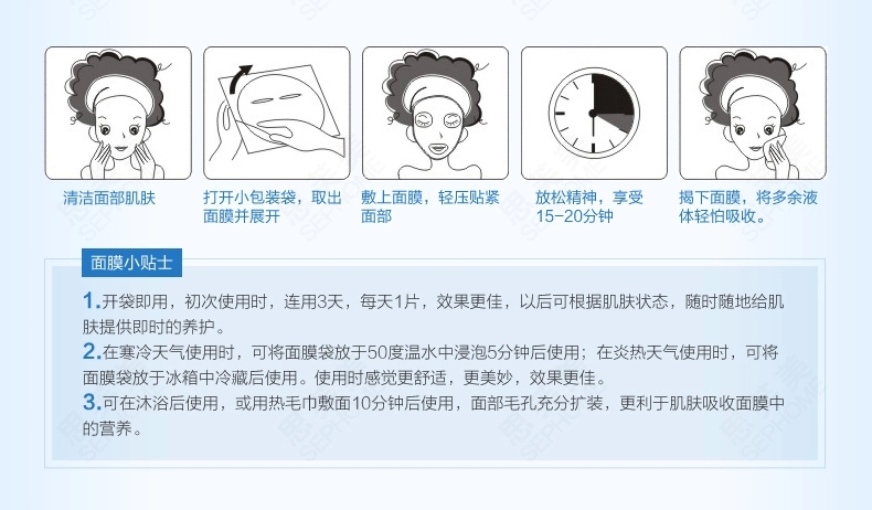 使用方法:洁肤后将面膜敷于面部,用手指轻压使其充分贴紧面部,静敷15-20分钟