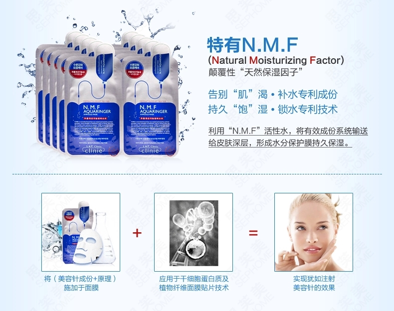 功效:具有深层补水、调节皮肤及修复毛孔的效果。利用天然保湿因子"N.M.F"的活性水,系统提供给皮肤深层水分,形成水分保护膜持久保湿;具有皮肤调节及毛孔修复效果的专利成分,金缕梅等帮助管理变大的毛孔;丝滑般感觉的纤维素面膜,无刺激,贴敷效果优秀,给提供肌肤集中保湿和丰富营养供给。敷完肌肤水润透亮又饱满,效果立竿见影,持续使用能彻底改善肤质。